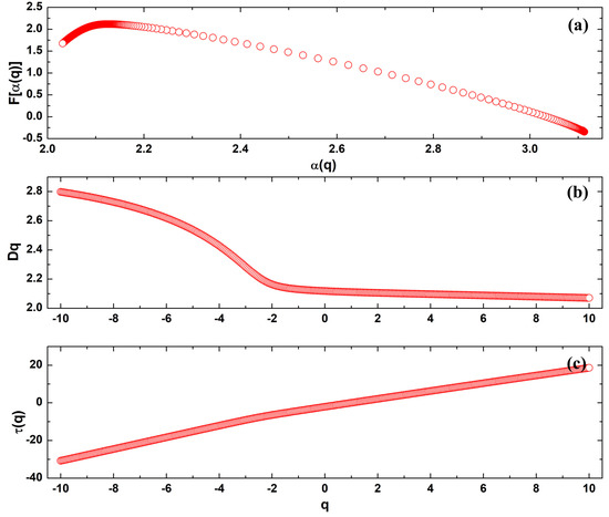 The mass exponent curve defines a relationship between moments of order (q) and generalized dimensions (Dq) and can be expressed according to Equation (5) [37].