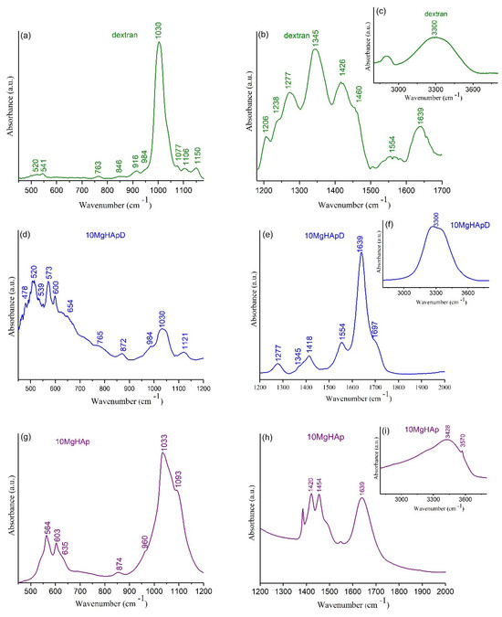 The FTIR-ATR spectra of 10MgHApD nanocomposites, magnesium-doped hydroxyapatite (10MgHAp) and dextran powder as reference spectrum are presented comparatively in Figure 10a–i. According to previous studies [33,60], the vibration bands distinctive to HAp were observed together with the characteristic bands of dextran (Figure 10).