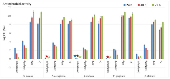 The microbial suspensions were prepared in phosphate-buffered saline (PBS) and then incubated for 24, 48 and 72 h, respectively, with the 10MgHApD nanocomposites. The values of the CFU/mL were determined. The experiments were performed in triplicate and the data were presented as mean ± standard deviation (SD). The statistical analysis was performed using the ANOVA single-factor test.