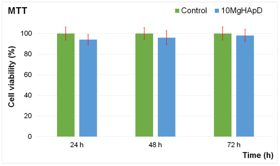 The graphical representation of the cell viability of HGF-1 cells exposed to 10MgHApD nanocomposites for 24, 48 and 72 h. The data are presented as mean ± standard deviation (SD) and are quantified as percentages of control (100% viability). The statistical analysis was performed using the ANOVA single-factor test and p ≤ 0.05 was accepted as statistically significant.