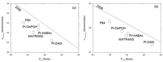 The selected membranes, a homologous series of polyimides with rather similar structures, cover a rather wide range of permeability and have selectivities that place their representative points in Robeson’s plots along lines parallel to the successive Robeson limits (selectivities decreasing with permeability increasing), particularly with the 2008 one, as shown in Figure 2.