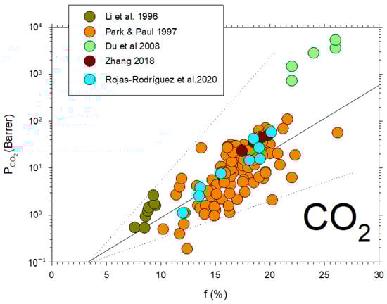 CO2 permeability as a function of the fraction of free volume for several data extracted from the literature [,,,,] is shown in Figure 6.