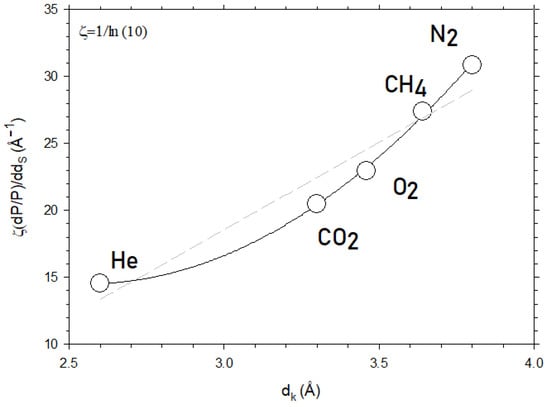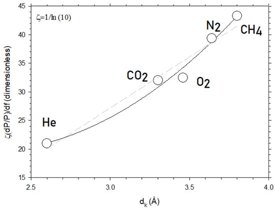 Figure 7 shows the slope of Figure 5 for CO2 and for the other gases studied here as a function of their kinetic diameter. Note that, in Figure 7, the ordinates correspond to the slope of versus which is proportional to , in accordance with Equations (5) and (7). The constant appears in order to pass from to because and the slope of versus is .