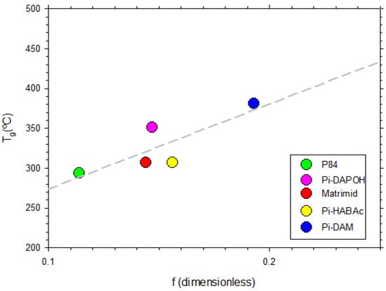 Referring to the dependence of free volume fraction on the glass transition temperature, Tg, Van Krevelen and Nijenhuis [] reported an increase in free volume with increasing Tg for an extensive assortment of polymers with a positive correlation, although with a considerable scattering. Hensema et al. recognized [] that the glass transition temperature may be an appropriate way to estimate free volume, although confirming wide deviations from any monotonous fitting line. More recently, White and Lipson [] showed, by a thermodynamic detailed analysis and experimental testing, that free volume at glass transition temperature must increase in an approximately linear way with Tg. This would justify that, for temperatures below Tg, the same or a similarly linear behavior would hold. This will be tested here for a homologous set of akin polymers, polyimides specifically, with a wide range of permeabilities.