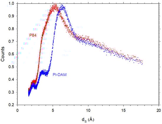 d-Spacing distribution for P84 and Pi-DAM showing the amorphous nature of our polymers. Note that the counts have been normalized to 1 for the most probable d-spacing.