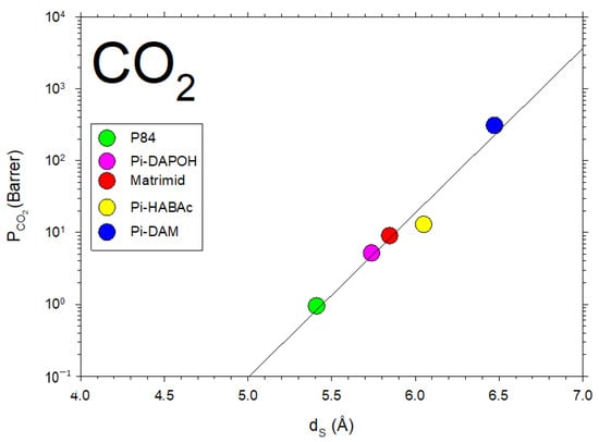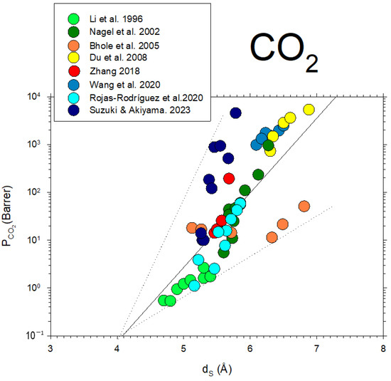 CO2 permeability as a function of dS from the literature [,,,,,,,].