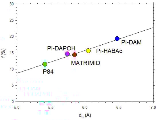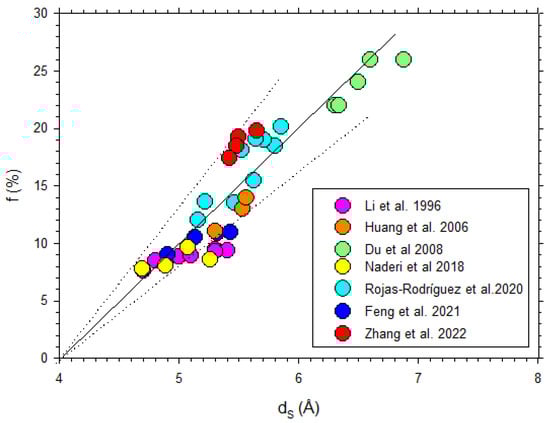 Some data from the literature [,,,,,,] on the free volume fraction versus d-spacing are shown in Figure 13, where it is seen that there is an average linear trend according to Equation (14).