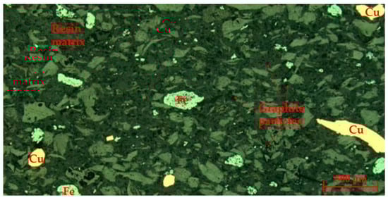The surface microscopic morphology of the specimen is shown in Figure 3. The gray area is the resin matrix, the bright white tissue is iron powder particles, the yellow tissue is copper powder, and the black region is graphite particles. In addition, the few white particles are magnesium oxide.