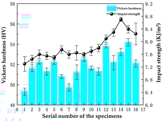 Vickers hardness and impact strength of the 16 sets of specimens.