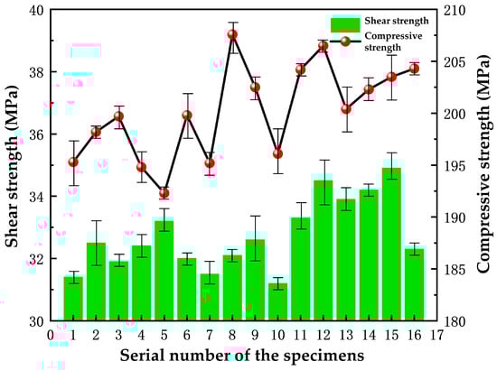 The compressive strength and shear strength of the 16 sets of specimens are shown in Figure 5. The compressive strength of the materials shows an increasing trend roughly with the increase in the cerium oxide content. It can be seen that the compressive strength values of specimens 8 and 12 are larger than the others. Specimen 5 has the smallest compressive strength value of 192.3 MPa. As can be seen from Figure 5, the fluctuation in the measurement errors for the shear strength is overall smaller when compared to the compressive strength, which may be brought about by the difference in the number of measurements and the accuracy of the instruments.