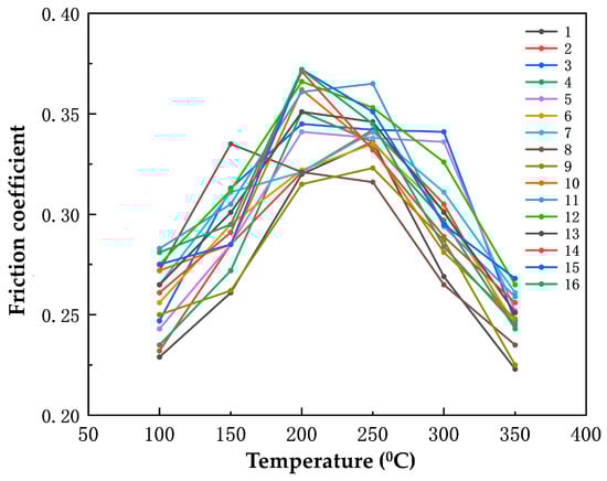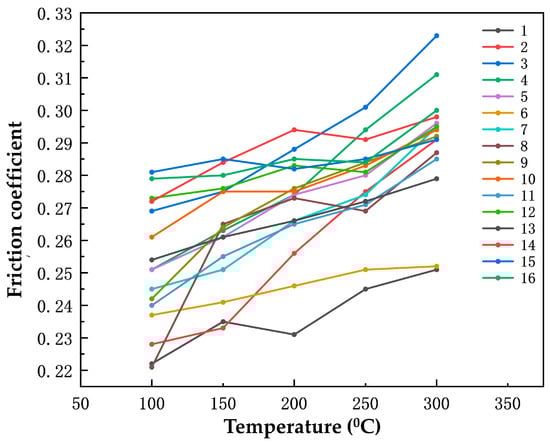 The friction coefficients of the 16 sets of specimens during the heating process.