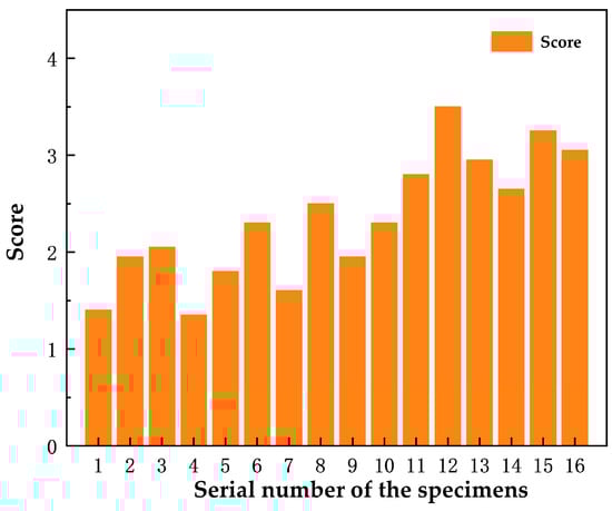 In this calculation as shown in Figure 9, specimens 13, 15, and 16 have higher comprehensive scores and better overall performance, while specimens 1 and 4 have worse comprehensive scores. Specimen 12 has the highest comprehensive score. The ratios of the three modified materials of specimen 12 are taken as the optimal solution, i.e., 2% cerium oxide, 2.5% yttrium oxide, and 3% nano-silica. To assess the reliability of these results, validation tests were conducted using these material ratios. The obtained results for the Vickers hardness, impact strength, compressive strength, shear strength, friction coefficient at 200 °C (during the heating process), and wear rate are 53.8 HV, 7.79 KJ/m2, 206.5 MPa, 34.5 MPa, 0.366, and 0.21, respectively. Comparing these validation results with the fuzzy predicted values, no significant difference is observed (p > 0.05). Therefore, it can be concluded that the optimized formulation parameters obtained through the fuzzy comprehensive evaluation method are accurate and reliable.