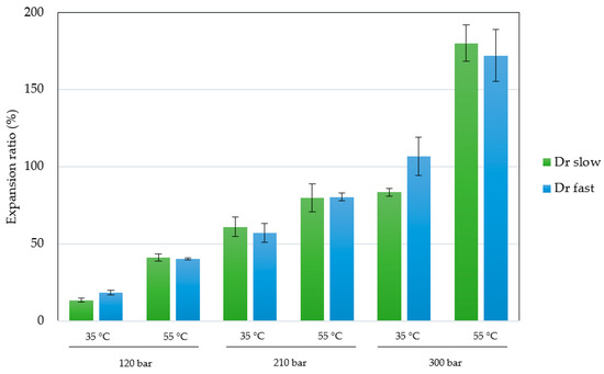 In relation to temperature, when experiments were carried out at a higher temperature (55 °C), higher expansion factors and consequently higher percentages of porosity were obtained. When temperatures rise the glass transition of the polymer, in this case the main polymer PLGA 75:25 has a glass transition temperature (Tg) of 45–47 °C [36], the polymer achieves its rubbery state and CO2 will diffuse readily into the polymer matrix, resulting in increased volume growth upon depressurization phase.