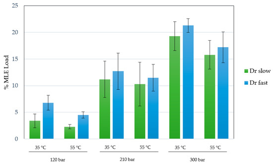 %MLE loading on impregnated scaffolds at 120–300 bar, 35–55 °C and 1–50 bar/min depressurization rate. All experiments were performed in duplicate.