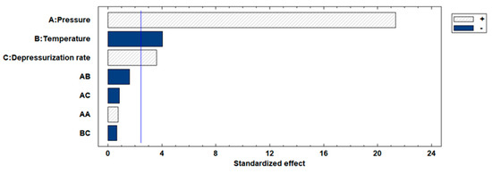 The impregnation percentages of the extract were obtained within a range of 2.4–21.3%. Studying the influence or statistical significance of each of the factors examined in the process (pressure, temperature, or depressurization ratio), all of them demonstrated a significant effect on the impregnation percentage of the extract in the produced scaffolds. Figure 6 shows the Pareto chart of the studied variables on the %MLE loading. On the other hand, binary interactions did not exhibit significant effects. With respect to individual factors, the effect was positive for pressure (p-value 0.0011) and depressurization ratio (p-value 0.0114), whereas temperature (p-value 0.0069) showed an opposite effect with a confidence level of 95%. The most favorable conditions (among those studied in the present work) to obtain a high %MLE load impregnation were 300 bar, 35 °C and a fast depressurization rate.