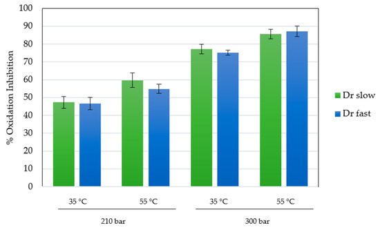 The antioxidant activity of the scaffolds impregnated under the best conditions (runs at 210 and 300 bar), with respect to the total impregnated load, was determined using the DPPH assay. The ability of the compounds presents in MLE to reduce DPPH and their capacity to reduce the presence of free radicals can be easily determined by the method tested. This capacity has been previously verified in the form of an extract and impregnated into other matrices, yielding high values of oxidation inhibition [17]. The presence of these free radicals or reactive oxygen species (ROS), can lead to various pathologies, inducing the well-known oxidative stress, potentially causing cardiovascular or neurodegenerative problems. The results for the scaffolds, expressed as percentage inhibition of oxidation, are shown in Figure 7. In order to compare the impregnation performance of the compounds and their activity, the extract was analyzed separately in liquid form. The used extract showed an isolated inhibition of DPPH oxidation of 92.2%.