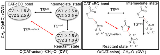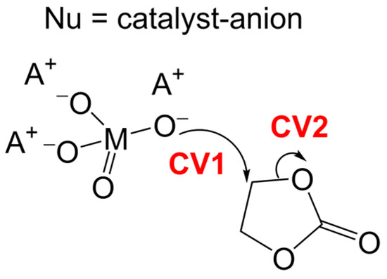 The nucleophilic attack by the catalyst anion to the CH2 of the cEC ring results in a terminal COO− and leads to the CO2 release. CV1 and CV2 are the distances used for MTD simulation.