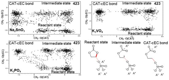 To run metadynamics simulations on the path shown in Figure 3, we have considered the distance between the nucleophilic oxygen atom of the catalyst anion and the methylene carbon in the cEC monomer, i.e., O−⋯C(CH2-O), as the first collective variable (CV1) and the C(H2)⋯O(ethereal) inside the cEC as the second collective variable (CV2). The MTD simulations have been performed at 413, 423, 433, and 443 K. For brevity, we only show the results of 423 K; for the other temperatures, we include the data in SI (Figures S1–S3). We have shown the variation of the CV1 versus CV2 in Figure 4 for the trajectory of cEC cleavage and catalyst attachment at 423 K, in which the two reaction coordinates (two distances) are plotted versus each other (x, y axis for CV1 and CV2, respectively). Investigation of the patterns created by the CVs in each plot indicates some similarities and differences between the path of catalyst attachment for different catalysts that can lead us to different elementary steps. We note that the three catalysts’ computational parameters and temperatures are equal. As shown in Figure 4, for Na2SnO3 and K3VO4 catalysts, the catalyst attachment path goes through an intermediate region of CV1 ≥ 2.5 Å and CV2 ≥ 2.5 Å. On the other hand, in the case of K3PO4, a diagonal transition path (that directly connects the reactant state to the catalyst–cEC complex) with a more significant density of the transient states, which is invisible for the SnO32− and VO43−, appears in the plot. Variation of CV1 versus CV2 in Figure 4 identifies different regions based on the density of the dots (transient structures). These regions are singled out in Figure 4 based on the values of the CVs. As can be seen in Figure 5 (left side), three stable states are observed: the reactant state (CV1 ≥ 2.5 Å, CV2 ≤ 1.6 Å), the intermediate state (CV1 ≥ 2.5 Å, CV2 ≥ 2.5 Å), and the state in which the CAT-cEC bond (complex) is formed (CV1 ≤ 1.6 Å, CV2 ≥ 2.5). The regions between these states indicate the transition state areas, i.e., TSvert., TShor., and TSNu−attack. On the right side of Figure 5, the schematic molecular structures corresponding to the highlighted regions are depicted.