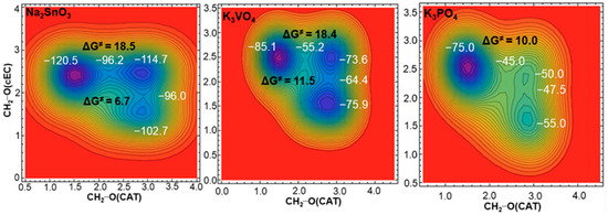 The activation free energies (ΔG≠) and CO2 contents for various cations for the PO43−, VO43, and SnO32− anions.