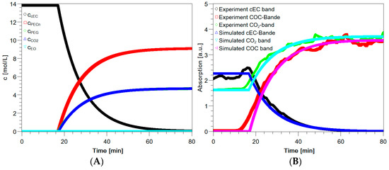 Representative results of fitting the kinetic model to the experimental data. Experimental conditions: TR = 170 °C, ccEC = 13.83 mol/L, cEthylenglycol = 1.38 mol/L, 0.01 eq. Potassium stannate. (A) Concentrate against the time of the reactants and products. (B) Fit the IR adsorption bands of the experiment to the experimental results.