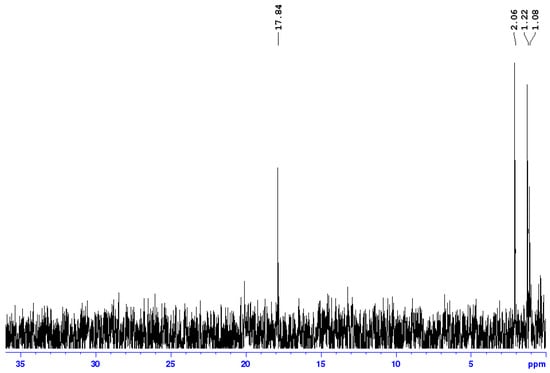 For the PO43− anion, the kinetic measurement results differ from those with SnO32− and VO43− as catalysts. The experimentally observed network of the reactions catalysed by PO43− is shown in Scheme 5. In this Scheme, kdes indicates the rate constant of catalyst deactivation, which is observed for PO43−. The results of the kinetic measurements and the rate constants are reported in Table 4. The literature (also shown in Table 4) shows that the ROP of cEC catalysed by phosphate has lower CO2 content in the final polymer (10% lower than K3VO4 and Na2SnO3) [46]. In addition to that, according to 31P-NMR, insertion of phosphate is observed during the polymerisation (31P NMR (500 MHz, CD2Cl2) δ 17.84 (s, 1P), 1.64 (d, J = 169.7 Hz, 7P), 1.08 (s, 2P)), shown in Figure 8. The peaks at 0–2 ppm can be assigned to potassium phosphate [47]. However, there is a signal at 17.84 ppm, which does not correspond to the signals of potassium phosphate. Instead, signals related to phosphonates can be found in this range [47].