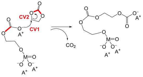 The examination of the CO2 release path of Figure 3 with MTD simulations confirmed that the higher nucleophilicity of the phosphate anion is the leading cause for easier CO2 release during the polymerisation of cEC. Considering that, the mechanism shown in Figure 3, which results in the attachment of the catalyst to the cEC ring, can proceed in parallel with the pathway shown in Figure 2. This work analyses this pathway and the elementary steps to conduct this molecular complex (between the catalyst anion and the cleaved cEC) to further chain growth and polymerisation. The experimental observations show that higher catalyst concentration increases the CO2 release. Additionally, at the beginning of polymerisation, the primary cause of the CO2 release is due to the cEC decomposition. Hence, the hidden elementary steps in the pathway shown in Figure 3 can affect the molecular weight of the polymer as well as the CO2 content and the overall reaction rate. We investigated this pathway in the current study to better understand the catalyst–cEC interaction and to address the role of catalyst characteristics.