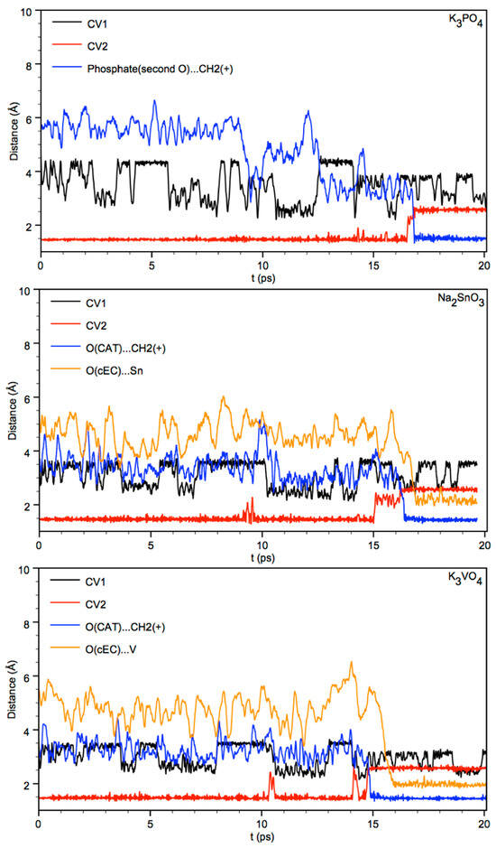 In insertion path III, the SN2 mechanism via the nucleophilic attack by the O(CAT) to the CH2 moiety of a neighbouring cEC is examined. We have run the insertion paths for all three catalysts at four temperatures and, after analysing all trajectories, besides CO2 release, two new pathways are revealed based on the MTD trajectories. We note that these new revealed paths were unknown. In one observed path, the second O of the PO43− anion attacks the CH2 of the second cEC, which means that chain growth can occur through a new channel via the second cEC cleavage. In the second observed path, the catalyst detachment for SnO32− and VO43− occurred. The two new observed paths are shown in Figure 11A,B. Path A was mainly observed for phosphate and path B for stannate and vanadate catalysts. The variation of the CVs versus the time evolution is depicted in Figure 12 for the trajectories with the two alternative paths. In addition to the CVs, the variation of the non-CV distances that lead to the new-unknown paths in Figure 11 is also depicted in Figure 12. As can be seen in Figure 12, alternative bond formation/dissociation can be probed in these trajectories instead of the considered CVs. Figure 12 upper part shows the second O(CAT)-CH2 bond is formed as soon as the cEC ring is cleaved (blue line). As shown for vanadate and stannate, two new bonds between the O(CAT)⋯CH2+ and O−(cEC)⋯central atom (V or Sn) are formed when the ring is cleaved (blue and orange lines, respectively). Observation of the paths shown in Figure 11 motivated us to examine the possibility of these methods of polymerisation and for the chain transfer (catalyst detachment) for the three catalysts throughout the calculation of the corresponding MD trajectories and ΔG≠ values.