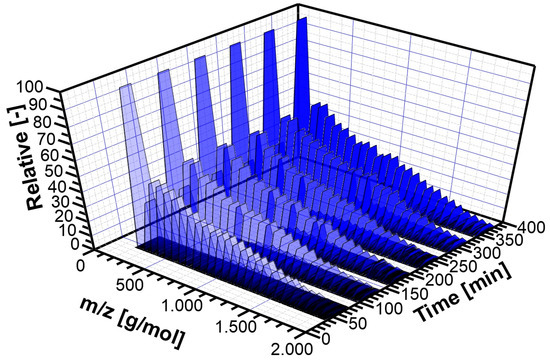Plot of LC-ESI-MS spectra over time for monitoring the development of the molecular weight of the polymer using K2SnO3 as the catalyst.