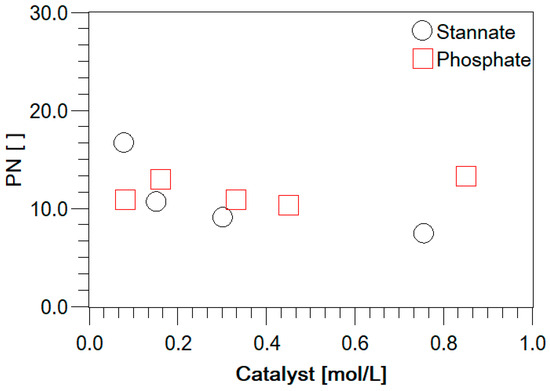 Plotting the degree of polymerisation against the catalyst concentration, it is apparent that the degree of polymerisation is constant within the experimental error. Since the catalysts are bases, this agrees with the observations of Rokicki et al. [6]. Furthermore, the calculated barriers of nucleophilic attack by the catalyst anions to the partially formed polymer chains are 25 and 38 kcal/mol for PO43− and SnO32−, respectively, supporting chain degradation at high temperatures triggered by an increased rate of back binding and acceleration of the transfer reaction. See Figure 16.