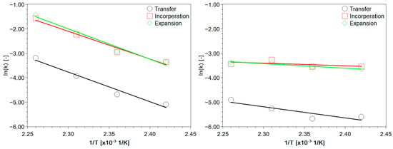 Left: Arrhenius plots of the growth reactions for the incorporation and non-incorporation of CO2 and the termination reaction (transfer) when using sodium orthovanadate (Na3VO4). The system used: catalyst (0.01 eq.), ethylene glycol (0.10 eq.), cyclic ethylene carbonate (1.00 eq.). Right: Arrhenius plot of the growth reactions for the incorporation and non-incorporation of CO2 and the termination reaction (transfer) when using potassium stannate (K2SnO3). The system used: catalyst (0.01 eq.), ethylene glycol (0.10 eq.), cyclic ethylene carbonate (1.00 eq.).