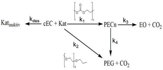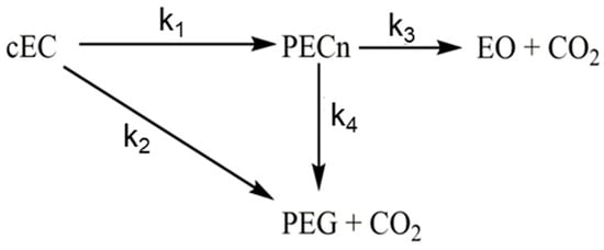 The experimental investigations on the kinetics of the polymerisation of cEC indicate that higher CO2 content can be obtained by the stannate and vanadate anions, which confirms the better performance of these catalysts for the ROP of cEC. Notably, the kinetic measurements confirmed that, at the beginning of the reaction, the primary source of the CO2 release is the cEC cleavage (decomposition). The schematic presentation of the experimentally observed reaction network for SnO32− and VO43− anions is shown in Scheme 4 and for PO43− in Scheme 5. k1 and k2 in Scheme 4 represent the rate constants of ring-opening polymerisation of cEC and the chain propagation with CO2 release, respectively, and k3 and k4 show the polymeric chain (PECn) decay due to decomposition or CO2 release from the chain, respectively.