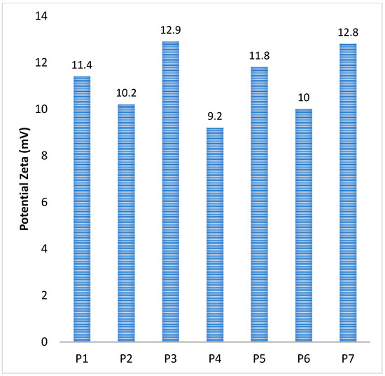 MP/NP stability in aqueous suspension was analyzed by Zeta potential measurements. The Zeta potential represents a physical property displayed by all particle categories in suspension. This property highlights the NP stability in suspensions depending on the NP surface charge. According to the literature studies, particles that exhibit a Zeta potential of above +30 mV or below −30 mV express adequate electrostatic repulsion to provide colloidal stability [45]. Table 1 summarizes the arithmetic average of Zeta potentials determined for MPs/NPs. The analyzed dried samples were dispersed in distilled water (c = 1.25 g/L) and sonicated for 15 min to avoid agglomeration. The determinations were performed in triplicate at 25 °C. The obtained results showed that all prepared samples presented good stability in aqueous suspension and were positively charged with a Zeta potential varying between 9.2 ± 0.3 and 12.9± 0.6.