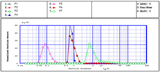 Laser diffraction is an important method for characterizing particle size in solution (Figure 5). The analysis was performed in acetone, which is a poor solvent for CS, thus avoiding the sample’s swelling. The data results were in good agreement with SEM observations and confirmed the particle size dependence on initial synthesis parameters such as polymer solution concentration and stirring speed. Higher emulsification stirring speed leads to improved dispersion and also to the generation of small droplets in the emulsion system, resulting in nanoparticles. MPs/NPs granulometric distribution curves (determined by laser beam diffraction (LD), Figure 5 and Table 1) have an unimodal aspect, and analyzed samples present a nanometric diameter, depending on the initial preparation conditions. In the case of samples P1–P4, the stirring speed was increased from 5000 to 15,000 rpm/min, and a size reduction was observed due to better dispersion of the emulsion phase. These results are consistent with earlier published data for CS hydrogel particles [26].