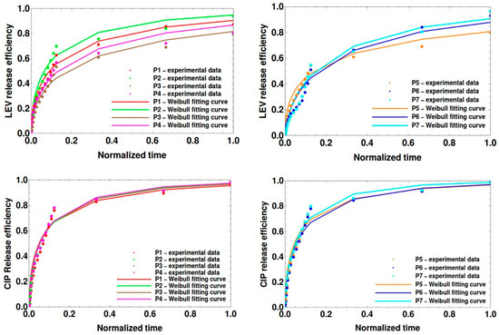 The experimental data and the Weibull theoretical curve for levofloxacin (first row) and ciprofloxacin (second row).