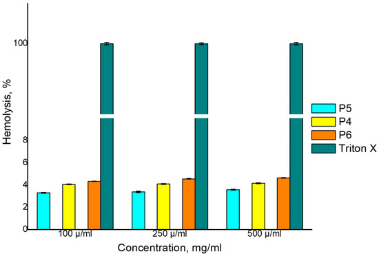 The hemolytic potential of MP/NP-based CS-PEGA has been studied. The hemolysis test is a mandatory requirement for blood-borne materials since their interaction with blood components may lead to erythrocyte lysis. For this reason, the effects of the prepared NPs on the blood were evaluated using a hemolysis assay. The results obtained from this study revealed that the degree of hemolysis increases with the increase of the NPs concentration (Figure 11). It has been found that the NPs prepared present very good compatibility with the normal blood (<10% compared to the positive control) [56]. Also, a 1% increase in hemolysis percentage for the P6 sample was observed in this case using an increased quantity of ionic crosslinker Na2SO4.