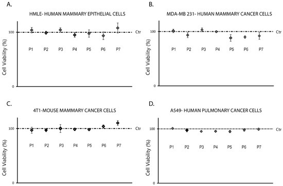All cells were cultured in a humidified atmosphere at 37 °C with 5% CO2. Moreover, 4T1 mouse breast carcinoma cells (ATCC, CRL-2539) and MDA-MB-231 human breast epithelial carcinoma cells (ATCC) were cultured as described by Gjerdrum et al. [37] MCF-10A (ATCC) (a gift from Prof. Dr. J. Lorens) were maintained in DMEM/F12 supplemented with 5% horse serum (Sigma Aldrich, Saint Louis, MO, USA), 20 ng/mL EGF (Sigma Aldrich, Saint Louis, MO, USA), 10 ug/mL insulin (Sigma Aldrich, Saint Louis, MO, USA), 0.5 ng/mL hydrocortisone (Sigma Aldrich, Saint Louis, MO, USA), 10 ng/mL cholera toxin (Sigma Aldrich, Saint Louis, MO, USA), 1% Pen/Strep (Sigma Aldrich, Saint Louis, MO, USA); A549 (ATCC) were cultured in F-12K Medium, supplemented with100 U/mL of penicillin and 100 μg/mL of streptomycin and 5% bovine serum (Sigma Aldrich Aldrich, Saint Louis, MO, USA). Cell viability was measured in 4 wells for each treatment at 72 h from starting the treatment. CellTiter-Blue® Cell Viability Assay (Promega, Madison, WI, USA) has been used to investigate cell viability. Measurements have been performed using a multi-plate reader (FilterMax F5).