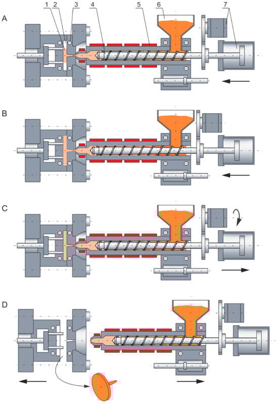 Injection forming: (A)—injection (filling), (B)—holding (packing), (C)—plasticizing (melting), (D)—mold opening (part ejection); 1—part (molding), 2—mold cavity, 3—cooling channels, 4—screw, 5—heaters, 6—hopper, 7—drive system (with permission from Rheology in Polymer Processing. Modeling and Simulation by K. Wilczyński; Carl Hanser Verlag: Munich 2021 []).