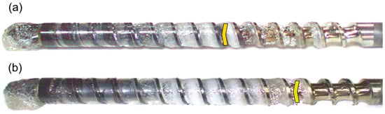 In general, the existing models of the injection-forming process (plasticizing system) discussed are different from the extrusion models in that they involve the static/dynamic phases of plasticizing. But it is assumed that the screw is fully filled with a material, like in the extrusion with flood feeding (Figure 2), which is inconsistent with our studies [] where starving was observed, like in the extrusion with metered feeding (Figure 4).