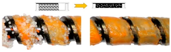 The first experiments on plasticizing in the injection-forming machines were made by Donovan et al. [], who used the “screw pulling out technique”. They noticed that the screw recharge was the transient plasticizing process, which gradually approached the equilibrium extrusion as the screw rotated. If screw rotation accounted for a large portion of the whole cycle time, plasticizing was similar to the extrusion, but if the screw rotation accounted for a small portion of the whole cycle time, plasticizing was significantly different.