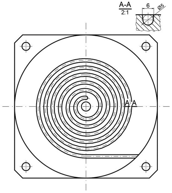 Experiments have been carried out to investigate the influence of the process operating conditions, screw rotation, and backpressure on the temperature of the material leaving the injection-forming machine and mold filling. Experiments have been carried out using a specialized spiral mold (Figure 5), and the length of the spiral molding was measured. The polymer melting temperature of the material flowing from the injection molding nozzle was measured using the thermal imaging camera FLUKE Ti480 PRO, manufactured by Fluke Corporation, Everett, WA, USA.