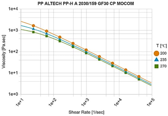 The polypropylene PP GF30 (Altech PP-H A 2020/159 GF30 CP, manufactured by MOCOM Compounds GmbH & Co. KG, Hamburg, Germany) was applied. The viscosity curve of the material is shown in Figure 6.