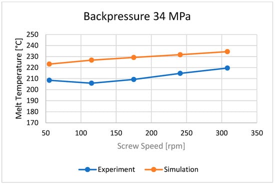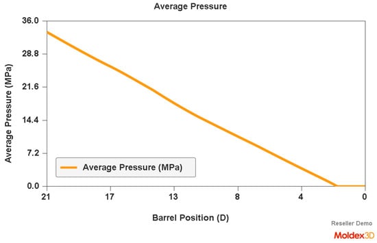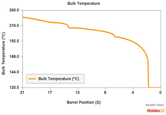 According to Gao’s observations [,], the backpressure influences plasticizing, pressure, and temperature distributions. It was observed that an increase in backpressure was advantageous to plasticizing. When backpressure increases, the screw cannot easily retreat, and the contact time between the material and the screw increases, generating more shear heat (energy dissipation), which causes the material temperature to rise.