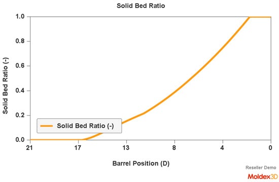 Simulations have been carried out using Moldex-3D (2023R3OR) software developed by CoreTech System Co., Ltd. (Zhubei, Taiwan). This program is capable of simulating the flow in the mold and the plasticizing system. It allows us to calculate the profiles of bulk temperature, pressure, shear rate, shear stress, solid bed ratio, relative un-melted polymer amount along the screw, etc. However, the modeling basics are not presented in the literature [].