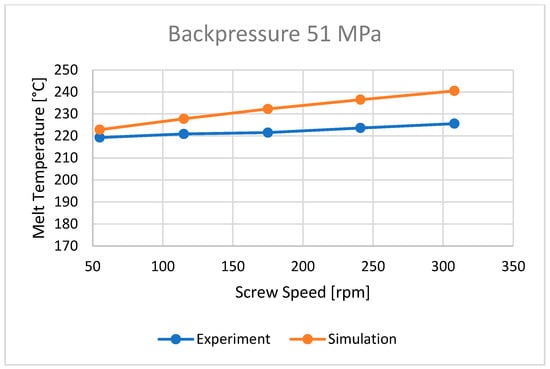 The influence of screw rotation N on the melt temperature at a backpressure of Pback = 51 MPa.