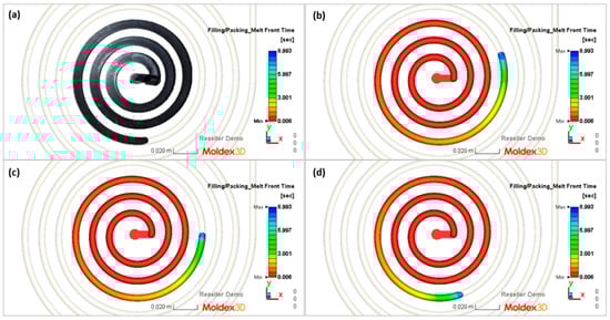 Spiral molding (part) and simulations (filling time) obtained at a screw rotation speed of N = 175 rpm and a backpressure of Pback = 34 MPa: (a) spiral molding, (b) A—simulation, (c) B—simulation, (d) C—simulation.