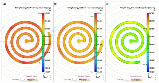 Simulations (melt front temperature) obtained at a screw rotation speed of N = 175 rpm and a backpressure of Pback = 34 MPa: (a) A—simulation, (b) B—simulation, (c) C—simulation.