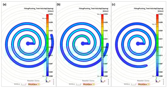 Simulations (total velocity) obtained at a screw rotation speed of N = 175 rpm and a backpressure of Pback = 34 MPa: (a) A—simulation, (b) B—simulation, (c) C—simulation.