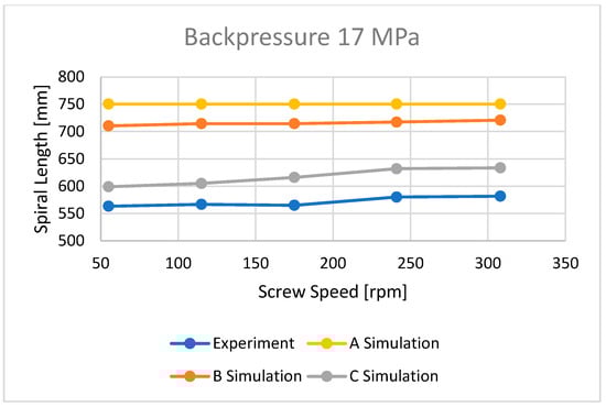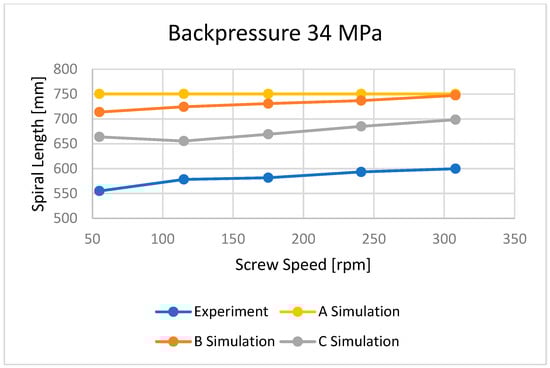 The flow lengths of the material in the spiral mold, calculated using different ways to determine the temperature of the material flowing into the mold, have been compared with the results of measuring the lengths of the spirals (Figure 13, Figure 14, Figure 15, Figure 16, Figure 17 and Figure 18).