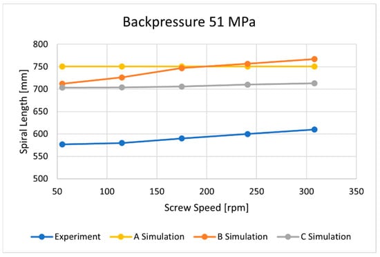 The influence of screw speed N on spiral length at a backpressure of Pback = 51 MPa.