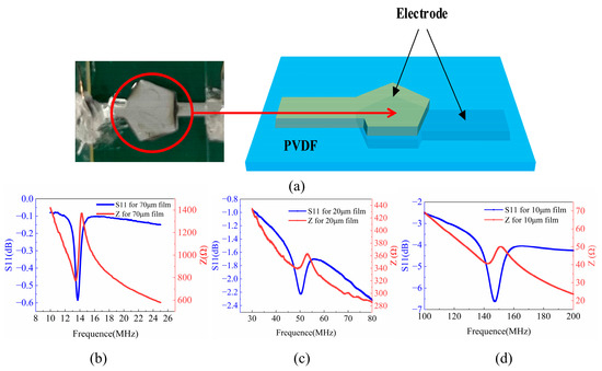 (a) A photo and drawing of the fabricated P(VDF-TrFE) BAW; S11 and Z spectra of (b) the BAW with a 70 μm P(VDF-TrFE) film; (c) with a 20 μm P(VDF-TrFE) film; (d) with a 10 μm P(VDF-TrFE) film, respectively.